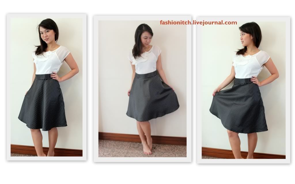 A flared polka-dot skirt paired with a flowy chiffon top... the di-cut circles create the look of petals and ruffles.